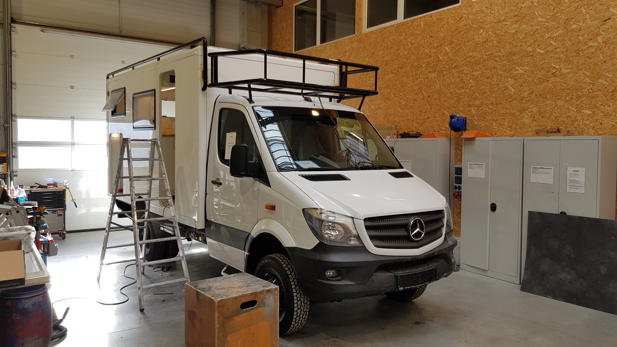 Nach schier endlosen Vergleichen von in Frage kommenden Basisfahrzeugen haben wir uns letztendlich für einen MB Sprinter 519 CDI mit EURO 6 Motor, 139 kW/190 PS, 6-Zyl., 3,0 l und Allrad entschieden. Der Wagen hat einen Radstand von 3665mm und ein zulässiges Gesamtgewicht von 5 to.